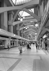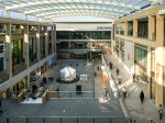 North Arcade is terminated by Middle Square, flanked by two larger shops and a supermarket, which is followed by the more conventional mall space of South Arcade (Building 3, Allies & Morrison), with a broad gallery and bridges at first floor level covered at a high level by a glazed roof, so it feels spacious and flooded with daylight. At the far end of this mall Leiden Square opens to the right, still under the high glazed roof, with the John Lewis store (Building 1, Glenn Howells Architects) enclosing the west end, with the final building (Building 2, Panter Hudspith) completing the complex to the south. Escalators lead to a third level roof terrace with restaurants and a cinema, as well as good views over the city. At the links between the four buildings, smaller lanes lead off to minor entrances, with an open connection to the old street of Turn Again Lane. These links are clearly intended to integrate the mall with surrounding streets and spaces, but in practice this is only partly successful: bus, train and car connections all tend to push visitors to the north (Bonn Square) and south (underground car park) entrances, while the adjacent streets are mainly residential.