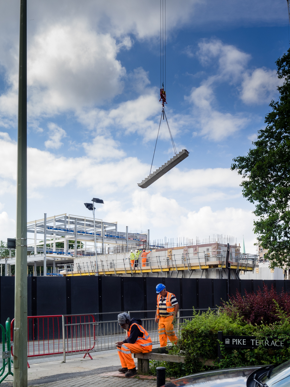 Westgate Oxford is a new, enlarged shopping centre incorporating the site of the former Westgate Centre (Douglas Murray, 1972) and some of its structure. It has more than doubled the retail floorspace of its predecessor, providing 100 new shops, some 25 restaurants, cafés and leisure spaces, and a cinema, in four large buildings. A smaller fifth building, an apartment block (Building 1a, One Abbey Place, Glenn Howells Architects), provides 59 one and two bed flats and incorporates the entrance to the underground car park (1000 spaces). This is a big deal for Oxford, not only bringing the city’s first John Lewis store but changing the geography of retail in the city centre.