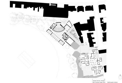 This is essentially a conference centre: the 136 seat auditorium, spacious foyer and seminar rooms meet the now standard requirement for a conference facility-cum useful extras for college life (with a dance studio as a bonus). In fact, the college markets the Sultan Nazrin Shah Centre as “a brand new conference centre”, something that might be expected to be rather dull and corporate. Yet with generous sponsorship, and impressive talent, the architect and construction team have contrived to insert an elegant and beautifully crafted piece of architecture into the charming setting of Worcester College’s extensive grounds, where the new building is perfectly positioned to overlook the cricket pitch. An artificial lake has been extended beside a terrace to group the Centre with the nearby Sainsbury Building (McCormac Jamieson and Prichard, 1984), the College’s other modern treasure.