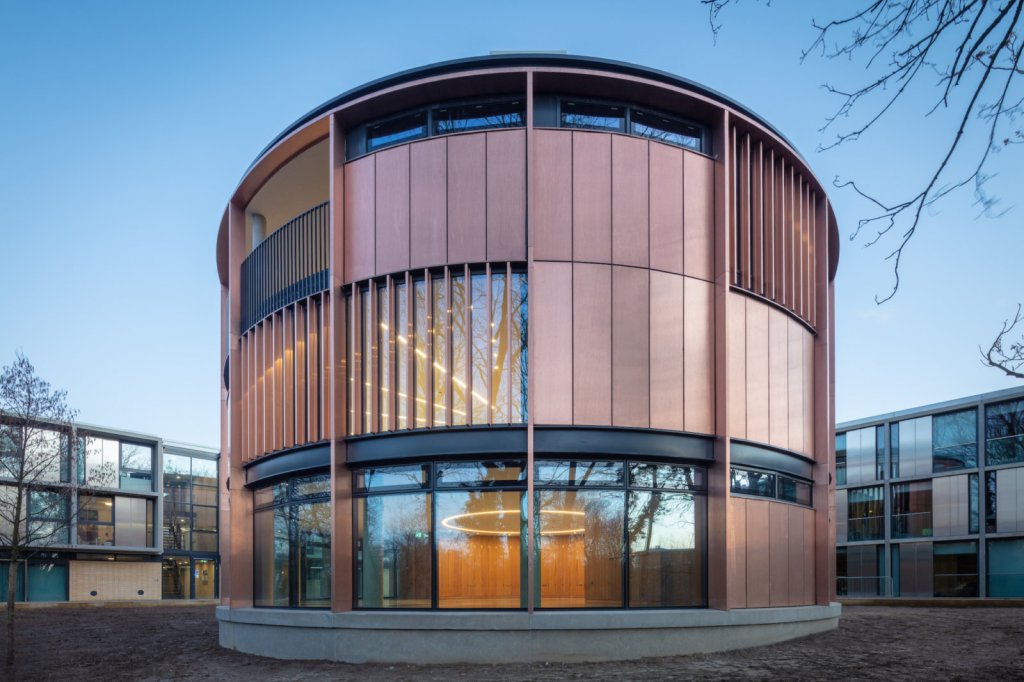Purcell’s contemporary addition mirrors the spacious rooms and long rectangular windows of the original buildings, whilst also conforming to the complex and constricted site on which it is set. The result is a very distinctive 3-storey cylindrical building containing a seminar room, common room and multi-use event space.