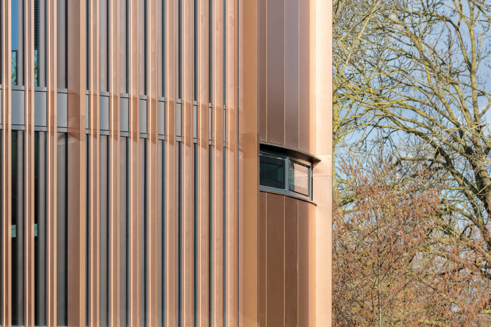 The building’s facade uses bronze and stainless steel cladding, whilst the interior features a variety of timbers, referencing Jacobsen’s use of these materials in previous projects on site. This serves to create a harmony between the ‘old’ and the ‘new.’ As well as a reference to other buildings on site, the bronze panels contrast aesthetically with stainless steel panels, which form part of the new student accommodation blocks adjacent to the Ainsworth Centre